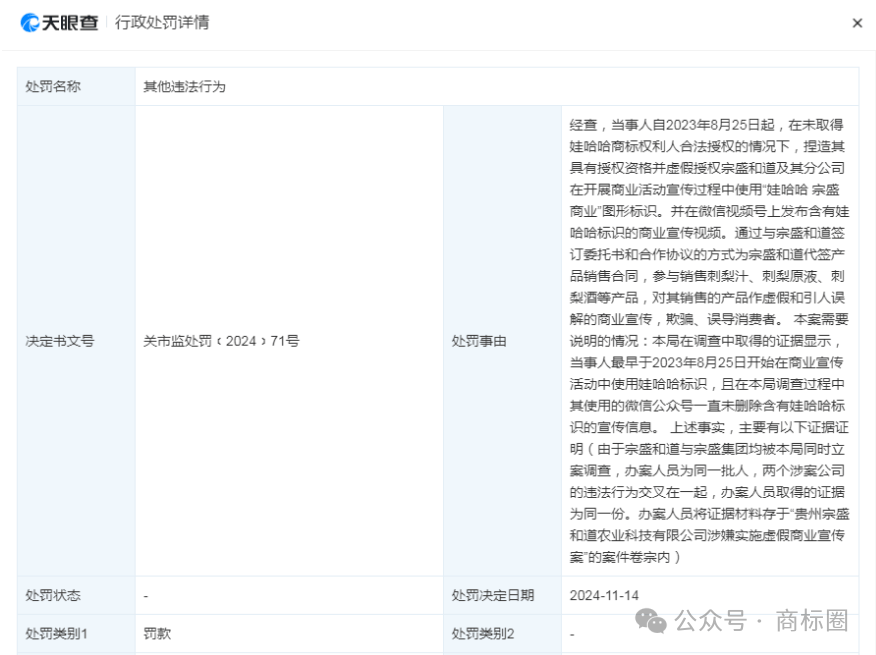 据悉,贵州娃茅酒业集团无限公司利用哇哈哈品牌字样、某某抽象以及娃哈哈公司相关文字内容用于企业及商品宣传,惹人误认为是娃哈哈商品或者取茅台集团存正在特定联系。千万没想到“娃茅酒”被罚后,该企业还有后招。